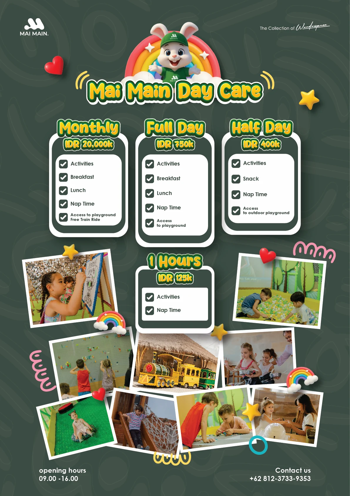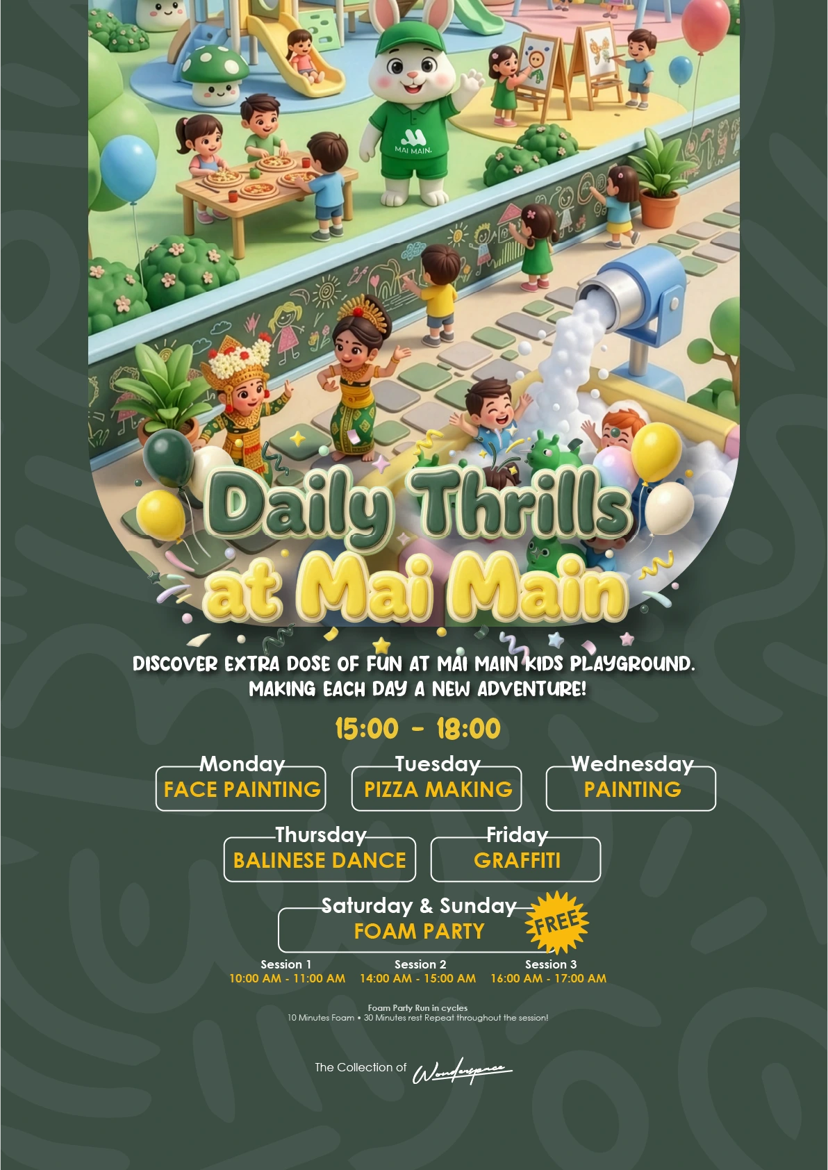 Explore all the fun-filled facilities at Mai Main Playground, from our interactive playzone, refreshing swimming pool, and the charming farmhouse for hands-on animal feeding. Stay tuned for exciting kids activities, including storytelling sessions, weekend workshops, and surprise guest appearances that spark imagination and joy!