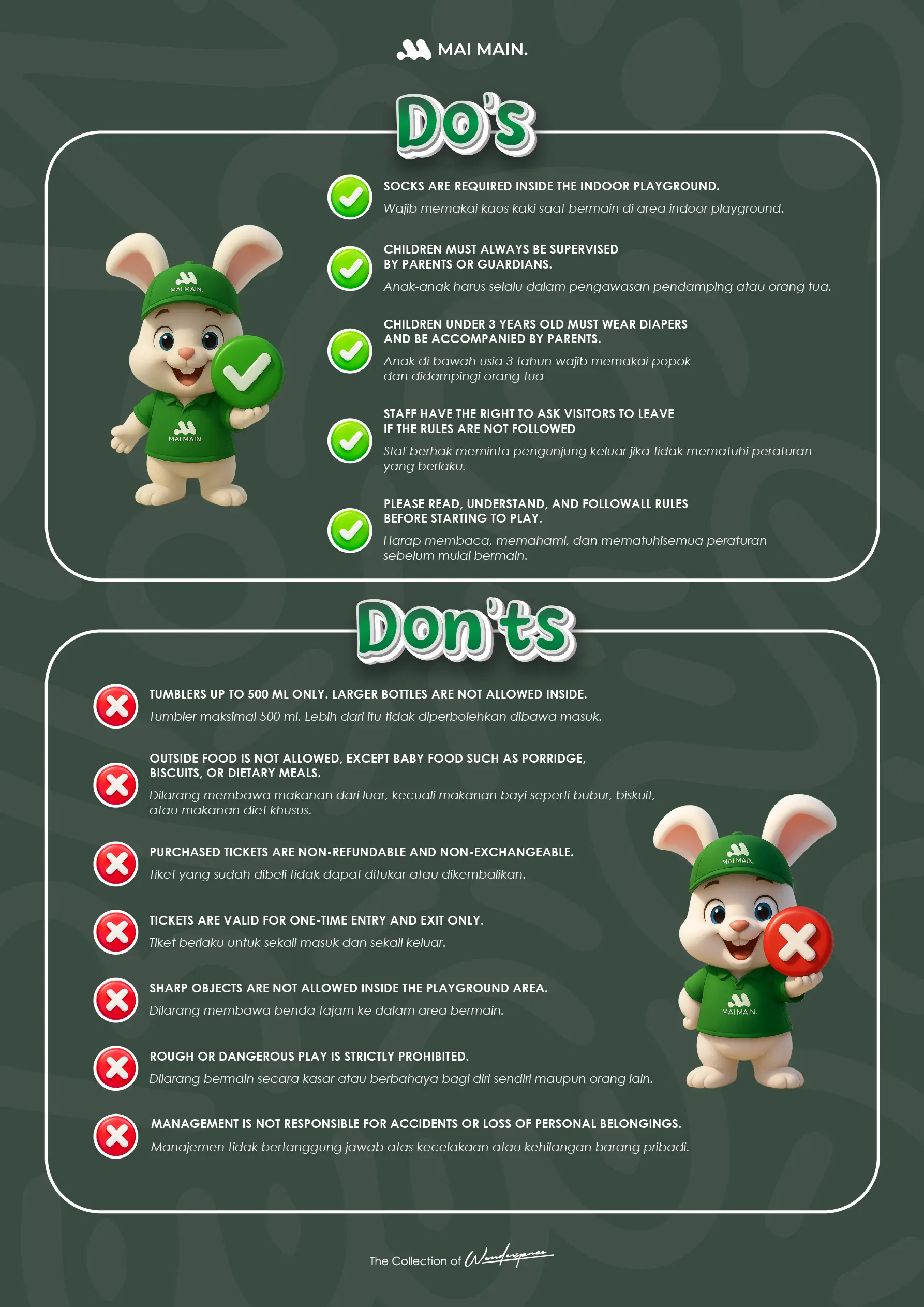 At Mai Main, safety comes first! This playground is designed so your little ones can explore, play, and have fun worry-free. All the play equipment is high quality, with regular maintenance and daily safety checks to keep everything in top shape. Whether they're playing indoors or outdoors, every area is carefully inspected to ensure a safe and happy adventure. Let your kids enjoy the best kids activities in Bali at Mai Main Canggu!