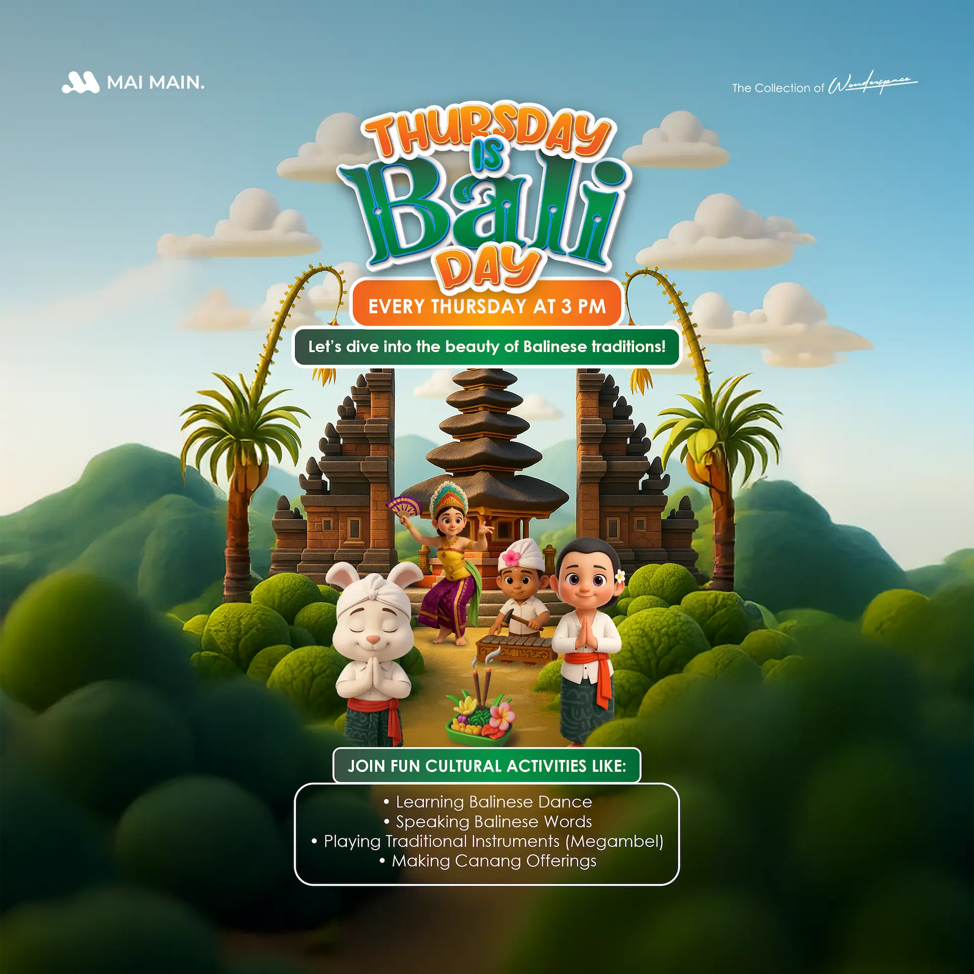 Let’s discover many fun activities at Mai Main Playground in Canggu to learn Balinese culture, starting from Balinese dance to making canang offerings. These activities will enrich your cultural experience while having fun to make unforgettable memories there!